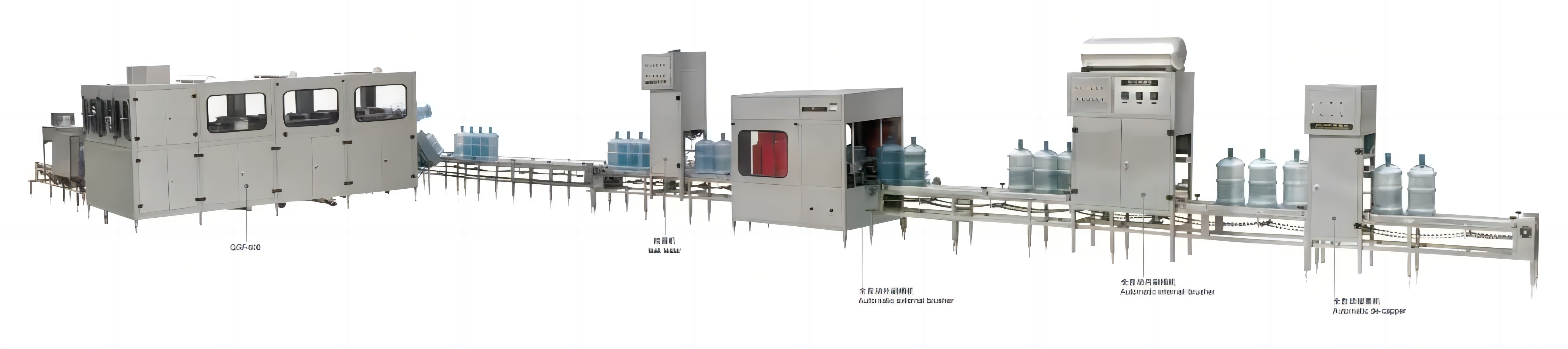生產流程(chéng):水處(chù)理、拔蓋、外桶清洗、內部(bù)清洗、灌裝、上蓋壓蓋(gài)、桶口套(tào)帽、碼垛(duǒ)入庫。